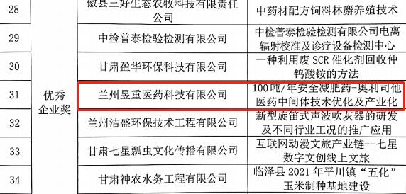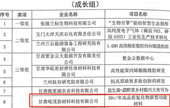 近日,,,,,,从第十一届中国创新创业大赛(甘肃赛区)组委会获悉,,,,,,兰州新区专精特新化工产业孵化基地的两家入驻企业——甘肃峻茂新材料科技有限公司和兰州昱重医药科技有限公司分别荣获第十一届中国创新创业大赛(甘肃赛区)优秀企业奖。。。。。。。
